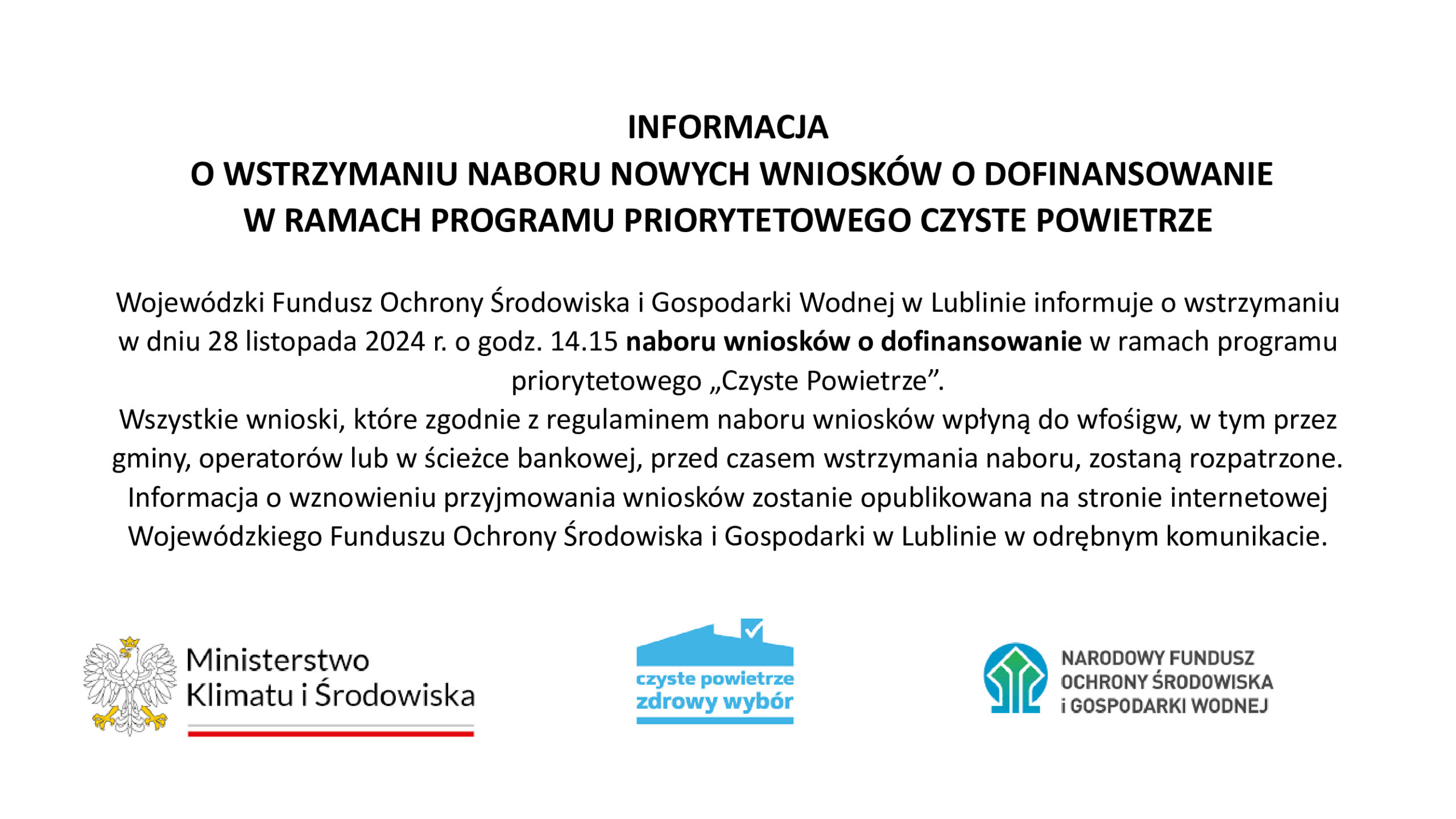 INFORMACJA O WSTRZYMANIU NABORU NOWYCH WNIOSKÓW O DOFINANSOWANIE W RAMACH PROGRAMU PRIORYTETOWEGO CZYSTE POWIETRZE