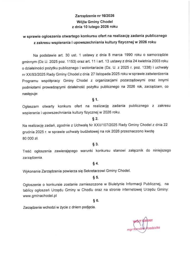 Informacja o ogłoszeniu otwartego konkursu ofert na realizację zadania publicznego z zakresu wspierania i upowszechniania kultury fizycznej w 2026 roku