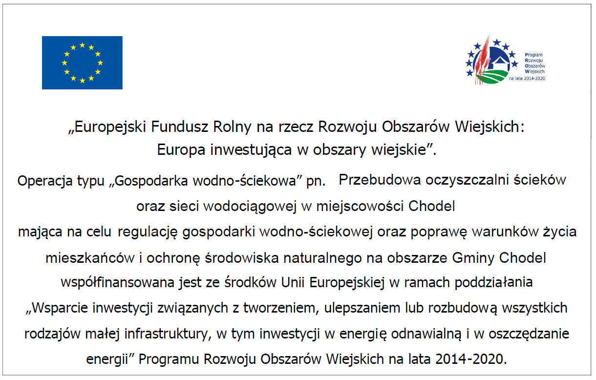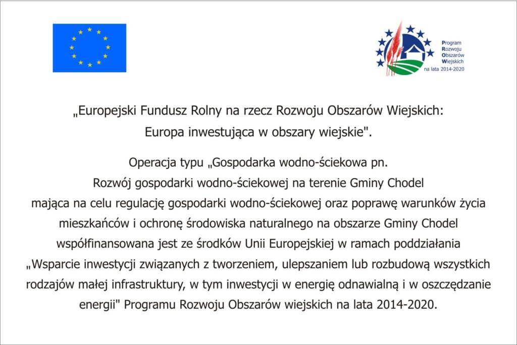 Gmina Chodel na podstawie umowy o przyznanie pomocy Nr 00237-65150-UM0310358/22 z dnia 17 stycznia 2024 r. otrzymała dofinansowanie na operację pn. Rozwój gospodarki wodno-ściekowej na terenie Gminy Chodel, której celem jest wsparcie lokalnego rozwój obszarów wiejskich poprzez budowę indywidualnych oczyszczalni ścieków na terenie Gminy oraz przebudowę ujęć wody w miejscowościach Granice oraz Jeżów, umożliwiającą poprawę jakości dostarczania wody i zabezpieczenia terenów przeciwpowodziowych, wpływających na poprawę warunków życia mieszkańców oraz regulację gospodarki wodno-ściekowej i ochronę środowiska naturalnego Gminy Chodel